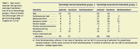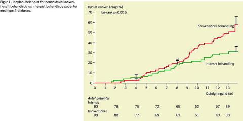 Den gennemsnitlige opfølgningsperiode var 13,3 år (7,8 år i interventionsstudiet og 5,5 år i observationsstudiet). Som vist i Tabel 1 døde 24 (30%) patienter i interventionsgruppen og 40 patienter(50%) i den konventionelt behandlede gruppe, hvilket svarer til en absolut risiko-reduktion på 20% (p = 0,02 ved log-rank-test). Hazard ratio for den intensivt behandlede gruppe sammenlignet med den konventionelt behandlede gruppe var 0,54 (95% konfidensinterval (KI): 0,32-0,89; p = 0,02).
