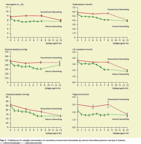 Ved afslutningen af interventionsstudiet efter 7,8 år havde den intensivt behandlede gruppe en signifikant bedre risikoprofil for nøglevariable i den medicinske behandling af type 2-diabetes og et markant større forbrug af lægemidler. Figur 2 viser forløbskurver for udvalgte risikomarkører i den samlede observationstid. For alle indsnævredes og udviskedes den tidligere signifikante forskel mellem grupperne, primært grundet en bedret regulering i den tidligere konventionelt behandlede gruppe. På dette tidspunkt var det gennemsnitlige antal lægemidler brugt på grund af type 2-diabetes eller komplikationer hertil 5,5 i den tidligere intensivt behandlede gruppe og 5,7 i den tidligere konventionelt behandlede gruppe, p = 0,64.
