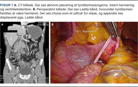 Vi præsenterer et forløb, hvor en patient blev indlagt akut med mavesmerter og ileus pga. intern herniering af tyndtarmsslynger under et Ladds bånd.