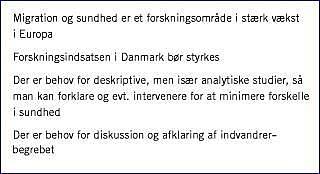 Migration og sundhed er et forskningsområde, der er i stærk vækst i Europa. Det drejer sig ikke længere blot om deskriptive studier af sygdoms- og dødelighedsmønstre, men om stadigt mere teoretisk velfunderede analytiske studier, hvis resultater bidrager til forklaring på og forståelse af disse mønstre. Også sundhedstjenesteforskningen vedrørende sundhedsvæsenernes håndtering af indvandrere er et vigtigt og voksende forskningsfelt, som belyser barrierer og handlemuligheder - bl.a. gennem kvalitative studier og kontrollerede interventionsstudier vedrørende optimal kommunikation og muligheder for forebyggelse gennem forbedring af sundhedsadfærd. Der er således nok at tage fat på for forskere og ikke mindst sundhedspolitikere, som bør medvirke til at opruste området.