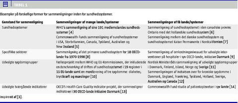 Sammenligninger kan omfatte hele systemer eller delelementer af sundhedssystemer, f.eks. den primære sektor, eller man kan se på, hvordan udvalgte sygdomme bliver behandlet i forskellige systemer (Tabel 1 ). I sammenligninger af sundhedssystemer har man ofte fokuseret på udgifter til sundhedssystemet og udvalgte indikatorer som udtryk for sundhedstilstand, f.eks. middellevetid, mens man i nyere analyser fra bl.a. WHO og OECD vurderer et bredere sæt af indikatorer for sundhed. Et eksempel på en overordnet sammenligning af mange sundhedssystemer er WHO's kontroversielle rapport fra 2000, der rangordnede sundhedssystemer i 191 medlemslande efter deres resultater målt med fem indikatorer [4]. Her blev Danmark lavt placeret, blandt andet fordi man vurderede, at sundhedsvæsenet ikke i særlig høj grad var i stand til at imødekomme befolkningens ønsker. Colombia opnåede et bedre resultat end Danmark på dette område. Undersøgelsen blev mødt af massiv kritik både i forhold til dens grundlæggende antagelser samt i forhold til tekniske aspekter [15]. Trods rapportens mange begrænsninger bidrog den til at understrege staters ansvar for sundhedssystemet - og befolkningens sundhed og dermed behovet for mere viden om, hvordan sundhedssystemerne påvirker befolkningens sundhedstilstand [16].