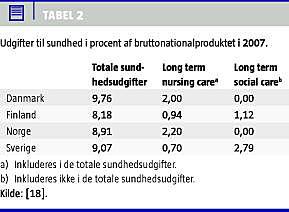 Et andet problem er forskelle i afgrænsninger af, hvad der i de enkelte lande defineres som udgifter til sundhed. Den måske vanskeligste gråzone er såkaldt langtidspleje til ældre og handicappede borgere, og her er spørgsmålet, hvad der hører ind under sundhed, og hvad hører ind under det sociale system. OECD anfører i definitionsforskrifterne, at den medicinske del af langtidspleje (Long Term Nursing Care (LTNC)) skal med som sundhedsudgift, mens den sociale del af langtidspleje (Long Term Social Care (LTSC)) ikke skal medtages. Denne forskrift fortolkes forskelligt af de 30 medlemslande. Tabel 2 viser totale sundhedsudgifter i procent af BNP for de fire nordiske lande. Danmark og Norge medtager stort set alle ældreplejeudgifter under sundhedsudgifter i stedet for at angive specifikke LTSC-udgifter. Finland og Sverige derimod definerer kun dele af deres langtidspleje som LTNC, dvs. som sundhedsudgift, mens resten defineres som LTSC. Det er således uklart, om der er tale om forskellige udgiftsniveauer eller om forskellige afgrænsninger af, hvad der defineres som sundheds- henholdsvis socialudgift.