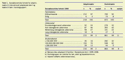 Aldersmatchningen gjorde det muligt at sammenligne adoptiv- og kontrolmødres alder, når børnene havde samme alder. Adoptivmødrene var i gennemsnit 5,4 år ældre end kontrolmødrene. Adoptivmødrene havde højere uddannelses- og indkomstniveau end kontrolgruppens mødre (Tabel 1 ).