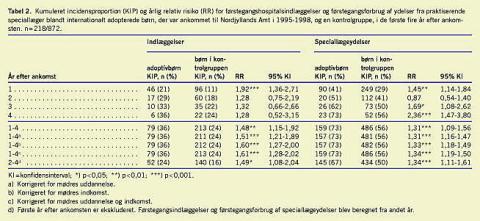 Materiale og metoder: Der blev foretaget en historisk opfølgningsundersøgelse af en fikseret kohorte af børn, der var internationalt adopteret til familier i Nordjyllands Amt i perioden 1995-1998, og en kontrolgruppe. Adoption var eksponering, og brug af sundhedsydelser var udfald. Data fra Landspatientregistret om indlæggelser på et somatisk hospital og data fra Sygesikringsregistret om ydelser fra alment praktiserende læger og praktiserende speciallæger blev indsamlet. Relativ risiko for indlæggelse på hospital og brug af ydelser fra speciallæge blev fulgt fire år efter ankomsten. Det gennemsnitlige antal indlæggelser og forbrug af ydelser fra alment praktiserende læger og praktiserende speciallæger blev fulgt i fem år.