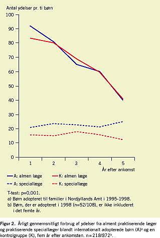 Resultater: De adopterede havde 61% større risiko for at blive indlagt og 34% større risiko for at få brug for ydelser fra praktiserende speciallæge end de ikkeadopterede, ligesom de adopteredes gennemsnitlige antal indlæggelser og forbrug af ydelser fra speciallæge var forøget. Det gennemsnitlige forbrug af ydelser fra praktiserende læge var forøget med 10% i det første år efter ankomsten, men der var ikke forskel i det samlede gennemsnitsforbrug.