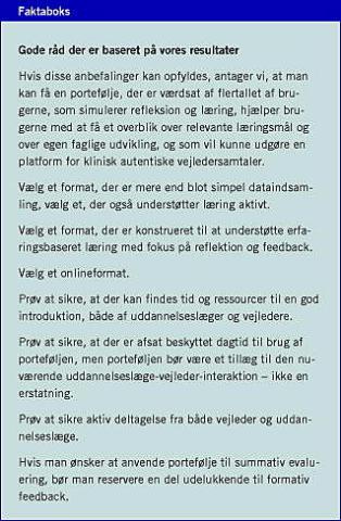 Resultaterne vedrørende porteføljen som et pædagogisk værktøj, forudsætningerne for succesfuld brug og nødvendigheden af vejleder (tutorlæge)-involvering kan forstås i et kontruktivistisk læringsteoretisk perspektiv, hvor læring finder sted gennem den kliniske erfaring, og hvor vidensdannelse sker gennem refleksion og feedback [6, 7]. Der er på dette punkt overensstemmelse med anden litteratur [8, 9], og vores kvalitative data understøttes af vores kvantitative data.