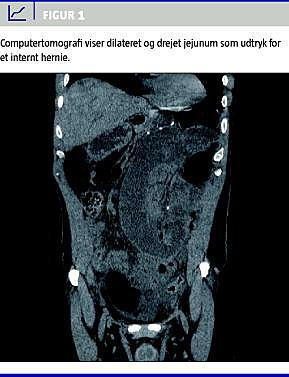 I. En 56-årig mand, der havde fået foretaget laparoskopisk gastrisk bypass to år tidligere, blev indlagt efter et døgn med tiltagende kraftige venstresidige mavesmerter, opkastninger, afføringsstop og en temperatur på 37,9 °C. Ved objektiv undersøgelse fandtes abdomen at være spændt overalt med anstrengte tarmlyde. Der blev udført akut computertomografi med kontrast, der viste ukomplet tyndtarmsileus med dilatation af proksimale jejunum på 5 cm (Figur 1 ). Klinisk overvejede man herniering, men havde ikke mistanke om tarmiskæmi. Tre timer senere fik patienten det alment dårligere med blodtingerede opkastninger, og ved fornyet klinisk undersøgelse var han peritoneal. Han blev herefter overflyttet til en specialafdeling, hvor man ved akut operation fandt ca. en meter iskæmisk tyndtarm, der var hernieret ind under jejuno-jejunostomien. Der blev foretaget tyndtarmsresektion med lukning af defekterne i abdomen, og herefter havde patienten et ukompliceret efterforløb.