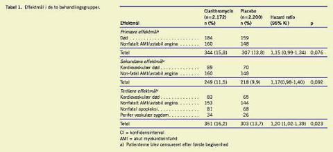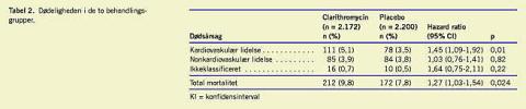 Incidensen af det primære, det sekundære og det tertiære effektmål var generelt højere i clarithromycingruppen end i placebogruppen. Forskellen var signifikant for det tertiære effektmål (Tabel 1 ). Patienter i clarithromycingruppen havde en signifikant øget dødelighed sammenlignet med de placebobehandlede patienter betinget af en signifikant øget kardiovaskulær dødelighed (Tabel 2 ). Rygevaner kunne ikke forklare denne forskel.