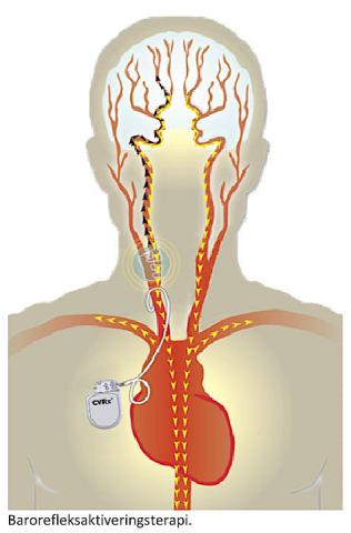 Begejstringen var stor, og en række positive, mindre, ublindede behandlingsserier fulgte, ligesom effekt på andre sympatikusdrevne tilstande antydedes. I Tyskland er der allerede behandlet ca. 5.000 ptt. på ca. 200 centre med varierende tilgang til patientselektion og dataopfølgning [1]. Dette på trods af at HTN-undersøgelsernes ublindede design og rekruttering på klinik-BT muliggør bias og konfounding. Blandt behandlingsresistente hypertonikere er der ved grundig udredning høj forekomst af »white coat-hypertension«, sekundær hypertension og non-compliance. Faktisk udviste en subgruppe af HTN2-ptt. en beskeden effekt på døgn-BT. I et norsk studie rekrutteredes ptt. på baggrund af døgn-BT efter overvåget medicinindtag. Andelen af »ægte« behandlingsresistent hypertension var lav, og RDN-effekten beskeden [1]. Også »regression mod midten« er en mulig fejlkilde, idet højt baseline-BT prædikterer RDN-effekt [2]. På danske centre udføres RDN i protokol og baseres på en grundig patientselektion og dataopfølgning med døgn-BT. En dobbeltblindet, sham-kontolleret, randomiseret undersøgelse med danske ptt. forventes afsluttet i år. Snart offentliggøres data på HTN3-trial med 530 ptt. randomiseret til RDN vs. sham. Vi ved imidlertid, at HTN3 er negativt på sit primære effektmål, klinik-BT [3]. RDN’s placering i den kliniske virkelighed er således uafklaret, og set i det lys er det utidigt, at RDN allerede udføres på danske privathospitaler uden om protokol. Et muligt alternativ til RDN er »barorefleksaktiveringsterapi« (BAT). Ved elektrisk stimulation af afferente barorefleksimpulser fra sinus caroticus simuleres blodtryksforhøjelse i CNS og modsvares af en reduktion i efferent sympatisk aktivitet og i BT-fald. Med en implanteret pulsgenerator til stimulation af carotisbaroreceptorerne er der over 12 mdr. observeret systoliske BT-fald på ca. 30 mmHg i forhold til placebo. Omkring 500 ptt. har fået implanteret systemet, og der ses trinvist BT-fald ved stigende elektrisk stimulering. En fordel er, at der kan gennemføres dobbeltblindede undersøgelser, med skiftevis aktiveret/inaktiveret system. BAT har været anvendt med et fald i BT på 22 mmHg hos ptt., hvor RDN har svigtet. Det første system anvendte bilateral elektrodeanbringelse. Et nyt system (se figuren), med mindre elektrode og mindre batteri, implanteres unilateralt ved en forsimplet procedure, og komplikationsraten er reduceret til under 10%, alle temporære. BAT er godkendt til anvendelse i Europa, men implantation er endnu ikke gjort i Danmark og kræver karkirurgisk ekspertise. BAT er en lovende, fysiologisk velbegrundet teknik, men rutinemæssig anvendelse kræver yderligere randomiserede studier, især mhp. sikkerhed [4, 5].