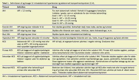 Der har gennem tiderne været mange forskellige definitioner på ACS. I øjeblikket defineres ACS som et vedvarende IAP > 20 mmHg associeret med nyopstået organdysfunktion [3]. Det er primært akut og subakut IAH, der kan udløse ACS. Tilstanden opdeles i primær, sekundær og recurrent ACS (Tabel 1) [4].