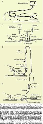 Blæretrykmåling udføres på følgende måde: Til intermitterende målinger benyttes kateter à demeure (KAD). Mellem KAD og urinopsamlingsposen placeres tre trevejshaner, således at systemet er lukket. En hane forbindes med et infusionssæt med 1.000 ml NaCl, en til en 25 ml sprøjte og en til en trykmåler. Trykmåleren nulstilles ud for midtaksillærlinjen (Figur 1B ). Ved måling instilleres 25 ml NaCl i blæren, og trevejshanerne indstilles, så der er åbent fra KAD til trykmåleren. Alternativt kan et Holtech Foley-manometer tilsluttes patientens KAD. Manometerets nulpunkt holdes ud for patientens midtaksillærlinje, og når en ligevægt har indstillet sig, svarer urinsøjlens højde til IAP (Figur 1C ) [6]. Til kontinuerlig blæretrykmåling benyttes et trelumenurinvejskateter. Det ene ben sluttes til urinopsamlingspose, det andet til et trykmålingssæt med infusion af isoton NaCl 4 ml/t, og i det tredje ben installeres væske i KAD-ballonen. Tryksættet kobles til en monitor. Systemet nulstilles, og tryksættet fikseres ud for midtaksillærlinjen (Figur 1D ) [2].