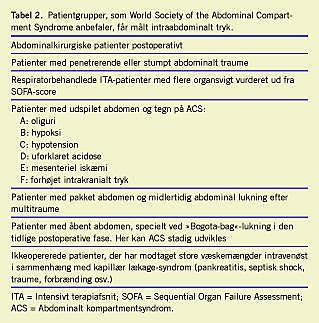 I Danmark findes der ikke tværfaglige retningslinjer for, hvilke patientgrupper der skal have målt IAP, og i et dansk studie har man påvist stor forskel på, hvilke patientgrupper der fik målt IAP [7]. Af Tabel 2 fremgår World Society of ACS's anbefalinger.