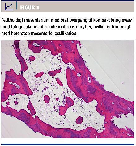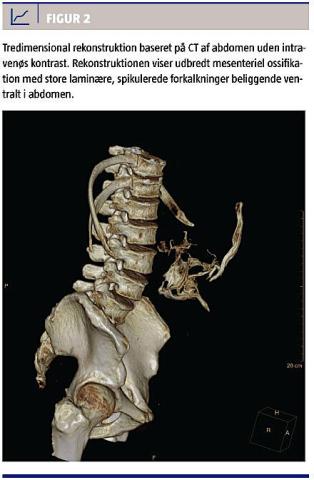 Heterotop mesenteriel ossifikation (HMO) er en yderst sjælden tilstand, der er karakteriseret ved omdannelse af det fedtholdige tarmmesenterium til trabekulært knoglevæv (Figur 1). Patofysiologien er ukendt, og der er på verdensplan rapporteret under 40 sygehistorier. Tilstanden ses efter mesenteriel iskæmi, generaliseret peritonitis eller abdominalt traume [1].