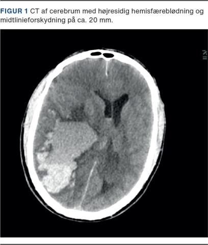 En 57-årig mand, som var tidligere rask og ikke fik medicin, blev indlagt efter fire dages anamnese med intens hovedpine. Ved ankomsten var patienten hypertensiv (med et blodtryk på 165/87 mmHg), bradykard (sinusrytme, frekvens 37 slag/min), ukontaktbar, Glascow coma score 6 med lysstive pupiller og anisokori. Blodprøver viste trombocytopeni (16 × 109/l), forhøjet fibrin D-dimer (> 20 FEU mg/l) og normal international normaliseret ratio (INR). Der blev foretaget en CT af cerebrum (CTc), som viste betydelig højresidig intracerebral hæmoragi (ICH) med midtlinjeforskydning (Figur 1). Der blev givet 2 g tranexamsyre intravenøst. Intubation og neuroprotektiv terapi initieredes med sedation (propofol/sufentanil), relaksans (rocuronium), hypertont saltvand (2 mmol/kg), eleveret hovedgærde og sikret middelarterietryk > 80 mmHg.