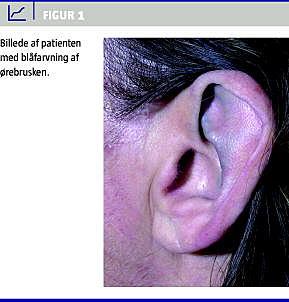 Patienten var en 50-årig kvinde med fire indlæggelser i vores kirurgiske afdeling. Hun havde klassiske tegn på alkaptonuri med blålig misfarvning af ørebrusken (se Figur 1 ), mørk urin efter henstand og ledsmerter i skulder, knæ, ryg og hofter. Patienten havde kendt alkaptonuri siden barndommen, og hendes moder og datter led af samme sygdom. Patienten fik i 1975 foretaget kolecystektomi pga. galdestensrelaterede smerter. Hun havde fået foretaget endoskopisk retrograd kolangio-pankreaticografi (ERCP) pga. koledokussten adskillige gange efter kolecystektomien på trods af sufficient papillotomi og stenfjernelse ved hver ERCP. Der havde ikke ved ERCP procedurerne været anlagt dræn i galdevejene. Ved hver indlæggelse, som havde et klinisk billede af kolangitis, blev patienten behandlet med antibiotika. Patienten fik foretaget abdominal ultralydskanning ved hver indlæggelse, som viste konkrementer i ductus hepaticus dexter og sinister og også i ductus choledochus. Der blev foretaget ERCP under to af indlæggelserne, hvor man fjernede en række mindre konkrementer fra galdevejene. Hendes kliniske tilstand ved de fire indlæggelser blev således betragtet som forårsaget af tilbagevendende tilfælde med kolangitis pga. intrahepatiske galdesten. Efter den sidste indlæggelse startede patienten en diæt med lavt proteinhold, specielt lavt indhold af fenylalanin og tyrosin. Efter at patienten er startet på denne diæt, har hun ikke haft smerteanfald i abdomen og ingen tilfælde af feber med en observationstid på fem år.