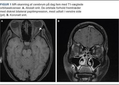 MR-skanning af cerebrum på dag tre var normal og uden empty sella, breddeøgede nn. optici-skeder, tortuøse nn. optici og stenose af sinus transversus. MR-skanning af cerebrum med orbitasekvenser på dag fem viste diskret venstresidig papilimpression (Figur 1A).