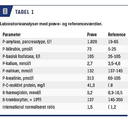 et intensivtafsnit, hvor han blev behandlet efter sædvanlige retningslinjer for akut pankreatitis. I forløbet fik han candidasepsis, som blev behandlet med intravenøst givet fluconazol. Herudover var forløbet ukompliceret, og efter syv dage kunne han flyttes til et sengeafsnit til fortsat jejunal sondeernæring. Herefter blev tilstanden gradvist bedre, og peroralt fødeindtag kunne genoptages. En kontrolgastroskopi viste normale forhold, og efter 40 dages samlet indlæggelse var blodprøverne normale, og patienten blev udskrevet.