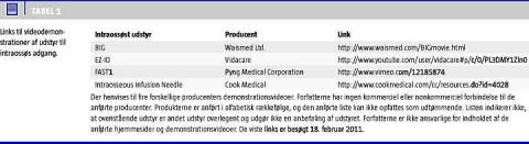 Ved akutte, kritiske tilstande, herunder hjertestop, anbefales hurtig anlæggelse af intravenøs (i.v.) adgang [1-3]. Specielt i akutte situationer kan det imidlertid være vanskeligt at opnå perifer i.v. adgang. I disse tilfælde anbefales etablering af intraossøs (i.o.) adgang både hos børn og voksne [3]. I.o. adgang er i mange akutte situationer både nemmere og hurtigere at anlægge end såvel perifer som central venøs adgang [4-6]. Ved hjertestop har trakeal administration af farmaka tidligere været anbefalet [2], men denne administrationsvej anses nu for at være obsolet [3].