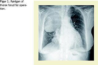 Røntgen viste afrundet fortætning (Figur 1 ) og computertomografi af thorax viste en inhomogen og intratorakal proces, som lå i relation til glandula thyroidea og strakte sig ned i højre side af mediastinum, forårsagende kompression af trachea (mindste tværsnitsareal: 0,81 cm2 ) og højresidige bronkiesystem, hvilket resulterede i atelektase. Processen var solid, stedvis cystisk og med et forkalket område. Endvidere sås bilateralt pleuraekssudat samt perikardieekssudat på 2 cm, men ingen forstørrede glandler i mediastinum eller kompression af kar. Tc-pertechnetat-thyroideaskintigrafi viste svag optagelse i glandula thyroidea uden optagelse svarende til tumor.