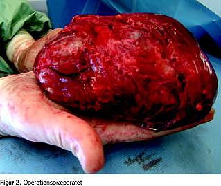Transtorakal histologisk nåleaspirationsbiopsi (TTB) fra infiltratet viste et minimalt fokus af nekrose og epiteliale celler med kernepleomorfi, men ingen inflammation. Nekrose var suspekt, og det fremgik af patologisvaret, at ikkesmåcellet karcinom ikke kunne udelukkes. Ny TTB viste obs. for atypiske celler. Der var ingen organspecifikke strukturer, ingen respirationsvejsepitelceller, og det var usikkert, om materialet repræsenterede pleura med reaktivt forandrede mesothelceller eller lunge med atypiske epitelceller. Patienten udviklede tiltagende respirationsinsufficiens, stridor og taledyspnø og var sengeliggende med behov for ilttilskud, men bedredes med prednisolon 50 mg daglig i løbet få dage og blev oppegående. Ved eksplorativ torakotomi fandt man en velafgrænset tumor (11 × 9 × 7 cm Figur 2 ) i mediastinum posterior, som komprimerede trachea og højre overlap. Tumoren havde velvaskulariseret kapsel, og der var ikke direkte forbindelse mellem tumor og glandula thyroidea, som var vital. Peroperativ frysesnitsdiagnose og efterfølgende paraffinsnitsmikroskopi viste follikulært opbygget, kolloidholdigt thyroideavæv med udbredte, degenerative forandringer og fokal nekrose uden malignitet. Patienten blev udskrevet fem dage postoperativt.