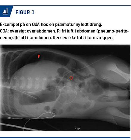 I. Dreng A blev forløst ved grad 3-sectio i uge 31 pga. svær placentainsufficiens samt patologisk hjertekurve og veaktivitet (vurderet på kardiotokogram). Mater A havde op til forløsningen registreret mindre liv. Dreng A fik fuld apgarscore ved fødslen. Hans blodsukkerniveau blev, på trods af tidlig enteral ernæring, målt til 0,5 mmol/l to timer efter fødslen, hvorfor der blev interveneret med intravenøst givet glukose og øget enteral ernæring til samlet 130% af normal døgnmængde (90 ml/kg/døgn). I andet levedøgn faldt fødeindtaget markant pga. stigende mængder aspirat. En radiologisk kontrol af et tidligere anlagt navlevenekateter viste manglende luft i rectum. Et rektalskyl var med blodtingeret afføring. En efterfølgende oversigt over abdomen (OOA) afslørede fri luft i abdomen, men ikke luft i tarmvæggen (pneumatose) (Figur 1). På mistanke om NEC foretog man akut operation med fund af et 20-25 cm nekrotisk område i terminale ileum, som blev reseceret, hvorefter der blev anlagt ileostomi.