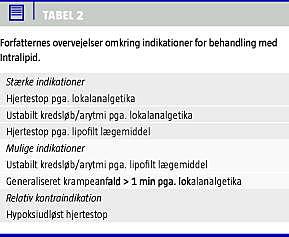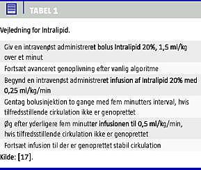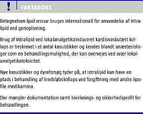 Summary Intravenous administration of lipids in poisoning caused by local analgesics Ugeskr Læger 2011;173(2):120-123 Objective: To draw attention to the use of intravenous lipids in the treatment of cardiac arrests caused by overdosage of lipophilic drugs. Case reports and animal studies have shown beneficial use of lipids in severe intoxication. The literature is reviewed. Conclusion: Lipids have a place in the treatment of severe cardiac events caused by local analgesics for regional anaesthesia. Lipids should be readily available when regional anaesthesia is performed. National guidelines should be prepared. Lipids may also be an option in the treatment of intoxication with other lipophilic drugs.