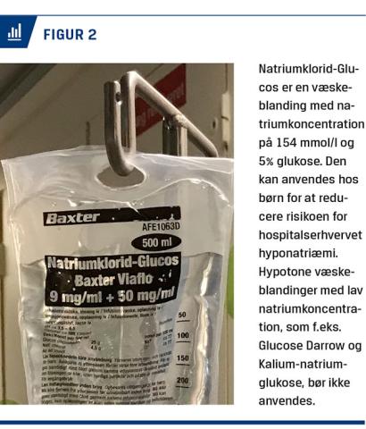 Formålet med i.v.-vedligeholdelsesvæske er at opretholde normal hydrering og normalt plasmaindhold af glukose og elektrolytter. På mange børneafdelinger i Danmark anvendes Glucose Darrow (Figur 2), Kalium-natrium-glukose eller tilsvarende hypotone væskeblandinger (Tabel 1). Traditionen for hypotone væsker stammer fra Holiday & Segars beregninger fra 1950’erne og er baseret på estimater af dagligt indtag af natrium og vand hos raske spædbørn [4]. I anbefalingerne tages der ikke højde for, at indlagte børn ofte har en øget sekretion af antidiuretisk hormon (syndrome of inappropriate antidiuretic hormone secretion (SIADH)), som reducerer nyrernes evne til at udskille vand, hvilket kan medføre hyponatriæmi.