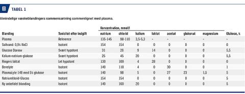 I de 19 randomiserede studier blev der primært anvendt to isotone væsker: isotont saltvand med en natriumkoncentration på 154 mmol/l og 5% glukose samt PlasmaLyte 148, en såkaldt balanceret væske med en natriumkoncentration på 140 mmol/l og 5% glukose, men hvor en del af chloridindholdet er erstattet af andre anioner, bl.a. acetat, glukonat og laktat (Tabel 1). Baggrunden for brugen af balancerede væsker er bl.a., at isotont natriumchlorid kan inducere metabolisk acidose [22]. Vi har ikke kendskab til randomiserede studier med hverken børn eller voksne, hvor man har