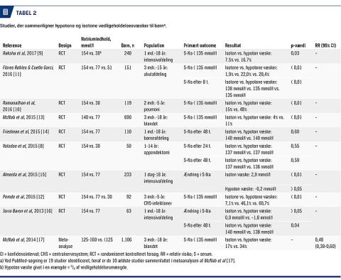 5 mmol/l forårsage alvorlige cerebrale symptomer [7]. Tilsvarende indebærer hyponatriæmi risiko for central pontin myelinolyse ved for hurtig korrektion af P-na-triumniveauet. Et lavt natriumindhold i vedligeholdelsesvæsken på 33-77 mmol/l i forhold til det i plasma på ca. 140 mmol/l kan bidrage til hyponatriæmi: Ved en PubMed-søgning (maintenance; intravenous; fluid, children) har vi identificeret 19 randomiserede studier, hvor traditionelle hypotone vedligeholdelsesvæsker med et natriumindhold på 33-77 mmol/l blev sammenlignet med væsker med et natriumindhold på 131-154 mmol/l (Tabel 2) [8-17]. Studierne omfattede børn, der fastede pga. kirurgiske tilstande, kritisk syge børn på intensivafdelinger samt børn, som havde infektioner, herunder pneumoni og CNS-infektioner, og var indlagt på børneafdelinger. I en metaanalyse, som omfattede 1.106 børn fandt man, at risikoen for hyponatriæmi var fordoblet hos børn, som fik hypotone væsker, sammenlignet med hos børn, som fik mere natriumholdige væsker (34% vs. 17%) [17] (Tabel 2). Siden er der gennemført ni randomiserede studier, hvor man med få undtagelser [8, 14, 15] har bekræftet metaanalysens konklusioner. I disse studier var forekomsten af hyponatriæmi 6% i de isotone grupper mod 20% i de hypotone grupper. Årsagen til, at der hos 6-17% af de børn, der fik væsker med natriumindhold på 131-154 mmol/l, udvikledes hyponatriæmi, formodes at være forbigående SIADH, der bl.a. forekommer postoperativt samt ved infektion, smerter, intrakranial sygdom og cancer [3].