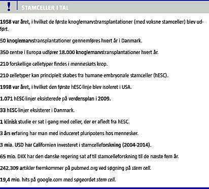 Samlet set er stamcelleforskningen et spændende felt, der er i rivende udvikling, og som i fremtiden med stor sandsynlighed vil resultere i nye behandlingsformer til mange patienter verden over. I stedet for symptombehandling vil der sandsynligvis komme kure til mange sygdomme og skader, der i dag dårligt lader sig behandle. Selv om der næppe er tvivl om, at stamceller vil revolutionere mange sygdommes behandling i fremtiden, fordres der tålmodighed hos patienter og læger, før disse nye koncepter udvikles, og vi kan se cellernes fulde potentiale udfolde sig (Tabel 1 ).