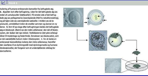 Når et embryon er 5-7 dage gammelt, befinder det sig normalt på blastocyststadiet, og herfra kan den indre cellemasse isoleres under mikroskop (Figur 1 ). I alt 50 til 100 celler overføres til dyrkning på et understøttende lag af humane bindevævsceller. Der anvendes et dyrkningsmedium med næring og vækstfaktorer, der kan holde hESC uspecialiserede. Dyrkningen foregår ved 37 °C i en atmosfære, der sikrer cellernes fysiologiske forhold. Med lidt held og tålmodighed opstår en ny stamcellelinje på denne måde, uden vi kender den direkte mekanisme [4].