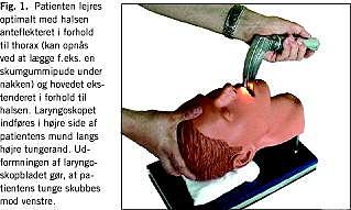 Patienten lejres optimalt med halsen anteflekteret i forhold til thorax (kan opnås ved at lægge f.eks. skumgummipude under nakken) og hovedet ekstenderet i forhold til halsen (sniffing position) (Fig. 1 ). Hos fede mennesker kan det være nødvendigt også at lægge noget under scapulae for at kunne bevæge hovedet i forhold til kroppen, når de ligger ned.