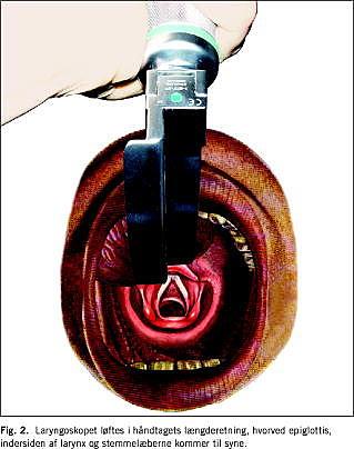 Laryngoskopet løftes i håndtagets længderetning, hvorved epiglottis, indersiden af larynx og stemmelæberne kommer til syne (Fig. 2 ).