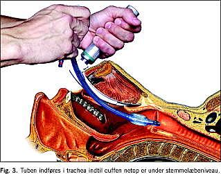 Tuben, evt. udstyret med en stilette, der tillader at forme den, indføres i trachea med højre hånd. Når tubespidsen er i trachea, trækkes stilletten tilbage. Tuben indføres indtil cuffen netop er forsvundet under stemmelæberne (Fig. 3 ).