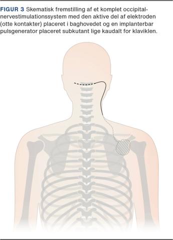 Behandlingen er en afart af PNS og bygger på 1-2 elektroder implanteret subkutant over nn. occipitalis major (Figur 3 og Figur 4). Virkningsmekanismen er ikke afklaret, men den mest udbredte hypotese er konvergens mellem disse nerver og autonome tråde til ganglion sphenopalatinum og ganglion trigeminale via centre i hjernestammen.