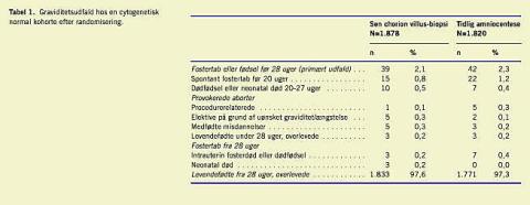 Resultater: I alt 3.775 gravide blev randomiserede, 1.861 til AC, 1.914 til CVS. Grupperne var sammenlignelige. Over 99,6% fik den undersøgelse, de var randomiserede til og 99,9% blev fulgt til efter graviditetens afslutning. Primært udfald var 2,1% for CVS-gruppen og 2,3% for AC-gruppen. Dog var hyppigheden af spontane fostertab før 20. uge og provokerede aborter af proce-durerelaterede årsager forhøjet på grænsen til signifikans. Hyppigheden af fund af fostre med klumpfod var forhøjet fire gange ved AC (p = 0,2) for hele materialet i uge 13. Data for uge 14 var utilstrækkelige.