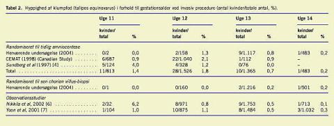 Vi fandt ikke større risiko for fostertab/for tidlig fødsel ved 28 uger ved CVS (2,1%) end ved AC (2,3%). De lave tab kan formentlig tilskrives de store krav til operatørernes erfaring og den omhyggelige ultralydskanning inden randomisering. Ser man imidlertid på tabstallene før 20 graviditetsuger og med-tager de fremkaldte aborter, der skyldtes formodede proce-dureproblemer, får man lige knap statistisk signifikant øget risiko efter tidlig CVS. I det canadiske studium [5] fandt man en forøget risiko for fostertab efter tidlig AC i 11+0-12+6 gestationsuge. Det samme gjorde Nicolaides et al [8] i et delvist randomiseret studie, mens Sundberg et al i et randomiseret studie [4] ikke fandt forøget fostertabsrisiko. Sundberg et al måtte dog standse deres projekt før tiden, da de som de første fik mistanke om en øget risiko for klumpfod ved tidlig AC, et fund, som de canadiske forskere hurtigt bekræftede. I herværende undersøgelse var materialet for lille til at bekræfte en øget risiko for fostertab.