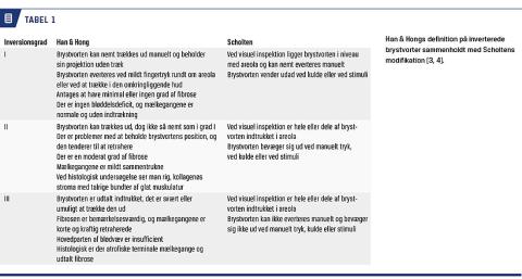 Der skelnes klinisk mellem retraheret brystvorte, hvor papillen i hvile er flad, men kan stimuleres til protrusion, og inverteret brystvorte, hvor papillen i hvile krænger indad under areolaniveau. Han & Hong har klassificeret inverterede brystvorter i forhold til graden og den underliggende ætiologi og histologi [3]. Scholten har modificeret klassifikationen til udelukkende at være klinisk [4] (Tabel 1).