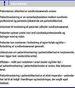 Summary Patient involvement in patient safety is necessary, but the effect is undocumented Ugeskr Læger 2012;174(45):2787-2790 Patient involvement has been on the patient safety agenda for years. Several initiatives have been launched, but in spite of support from health-care professionals, patients and administrators the concept is not yet integrated in every day clinical practice. The vision is to create partnerships for the purpose of preventing patients from harm due to their contact to healthcare. The literature offers good ideas but is also characterized by lack of methodological rigor. A change of values and habits, a supportive infrastructure and further research is needed to reach the goal.