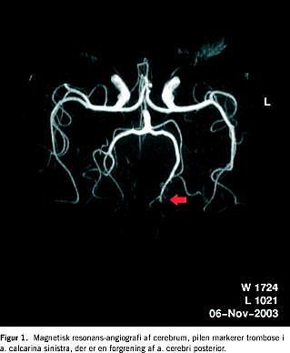 Ved en synsfeltsundersøgelse ved kampimetri blev der fundet massiv højresidig homonym hemianopsi med makulær sparring. I øvrigt blev der fundet normale forhold ved øjen-undersøgelse. Blodtrykket ved indlæggelsen var på 150/100, og ved senere målinger var det normaliseret til 130/80. Patienten blev udredt paraklinisk for bl.a. hyperviskositetsyndrom og hyperkoagulable tilstande, og blodprøveværdierne inklusive værdierne for trombocytter, koagulationsfaktorer, antitrombin, aktiveret partiel tromboplastintid (APTT), protein C, protein S, lupusantikoagulans, kardiolipinantistof, homocystein, kolesteroltal og blodsukker lå inden for normalområdet. En computertomografi af cerebrum viste iskæmisk infarkt i venstre occipito-parietale region. En magnetisk resonansangiografi af de cerebrale kar og aa. carotides viste en okklusion af a. calcarina sinistra, der er en forgrening af a. cerebri posterior (Figur 1 ). Ved undersøgelsen blev der i øvrigt fundet normale arterier både intracerebralt og i aa. carotides, dvs. at der ikke var atrioventrikulære malformationer, aneurismer eller cerebral aterosklerose, som kunne forklare patientens symptomer. Ved elektrokardiogram og ekkokardiografi blev der fundet normale forhold, og ved en transøsofageal ekkokardiografi sås der ingen tegn på persisterende foramen ovale, og der var således ingen holdepunkter for kardial embolikilde.