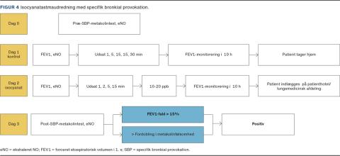 SBP-protokol er baseret på anbefaling fra European Respiratory Society (ERS) [20]. Der er udarbejdet en isocyanatprotokol baseret på ERS Handbook [19] (Figur 4). Der anvendes et standardiseret symptomskema, fra Imperial College, Brompton Hospital i London. Symptomer, FEV1 og eNO måles hyppigt under provokationen. Alle FEV1-værdier måles med et transportabelt EasyOne Air Spirometer (NDD Medical Technologies, Andover, MA, USA). På dag et eksponeres patienten for et irritativt kontrolstof, f.eks. maling eller butylacetat. Formålet med kontroldagen er at sikre, at patientens lungefunktionsteknik er i orden, at lungefunktionen er relativt stabil (< 10% udsving), og at der ikke er tale om en uspecifik forværring af astma. På den aktive provokationsdag eksponeres patienten for 10-20 ppb isocyanat. Patienter med svær astma indlægges mellem dag to og dag tre. På dag tre gentages lungefunktion og metakolintest. Patienten udskrives efter lægesamtale og svar på undersøgelsens resultater. Astmamedicinen genoptages, og patienten undersøges ambulant efter 2-4 uger, hvor astmabehandlingen kontrolleres, og en fastholdelse til arbejdsmarkedet drøftes. Alle data registreres i en klinisk database: Erhvervsrelaterede bronkiale og nasale provokationer, REDCap OP_170. Positive provokationer er indrapporteret til den store europæiske SBP-databaseEuropean Network for the Phenotyping of Occupational Asthma [21].