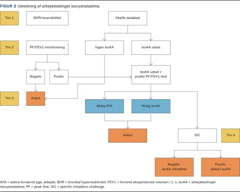Isocyanater findes på mange arbejdspladser. Diagnosen er udfordrende, da sensibilisering normalt ikke kan påvises [16, 17]. Der findes en isocyanat-IgE test(Thermo Fisher Scientific, Göteborg), men disse målinger har lav sensitivitet og er sjældent positive [5]. Derudover er undersøgelsen ofte negativ ved SBP-verificeret isoAA. IsoAA-symptomer kommer oftest efter arbejdet. Døgn-FEV1/PF-variation vurderes ved monitorering ligesom ved HMW-AA.