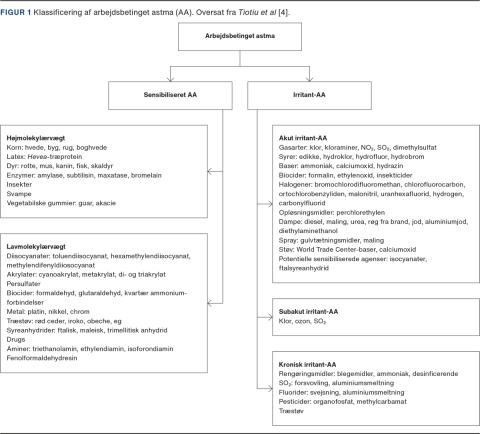 Ved nyopstået astma i voksenalderen bør arbejdsbetinget astma (AA) overvejes, idet 15-25% af alle astmatilfælde er relateret til arbejde. Det omfatter de novo-astma fra agenser på arbejde (50-90%) og astma forværret på grund af arbejde (AFA) (10-50%) [1, 2]. Da ca. 50 AA-tilfælde anerkendes årligt af Arbejdsmarkedets Erhvervssikring, må man formode, at der er en underrapportering og -udredning af AA. AA opdeles i sensibiliseret induceret og irritantinduceret arbejdsbetinget astma (iAA). Mere end 350 agenser i arbejdsmiljøet kan forårsage AA [3]. De mest almindelige er vist i Figur 1 [4]. iAA er en følgevirkning efter en arbejdsulykke med irritanter (røg fra brand, NH3, NOx etc.) i form af reactive airways dysfunction syndrome.