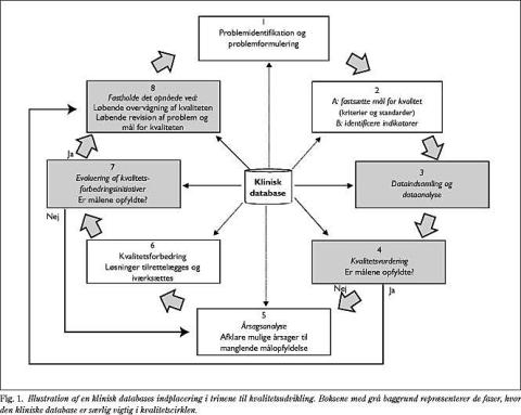 Databaser for klinisk kvalitet, ofte benævnt kliniske kvalitetsdatabaser eller kort kliniske databaser (KDB), er udset til at være et værktøj med strategisk betydning (1-3) for understøttelse af trinene i kvalitetsudviklingsprocessen (Fig. 1 ). En klinisk database er et register, der indeholder udvalgte kvantificerbare indikatorer, som kan belyse dele af eller den samlede kvalitet af sundhedsvæsenets indsats og resultater for en afgrænset patientgruppe med udgangspunkt i det enkelte patientforløb (4). En velfungerende klinisk database er kendetegnet ved faciliteter til: indrapportering: registrere og validere alle relevante data, databearbejdning: datalagring med tilkoblet statistik- og analyseværktøjer til at beregne indikatorværdier samt udrapportering: generere rapporter, der overskueligt og inden for en kort tidsramme præsenterer indikatorværdierne for brugerne.