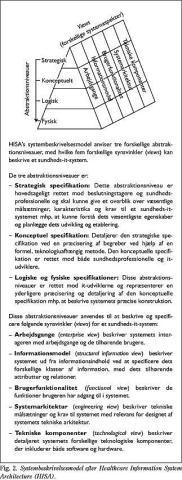 Som ramme for beskrivelsen af de to generationer af it- systemer anvendes der en anerkendt model, den europæiske præstandard Healthcare Information System Architecture (HISA) (8), der anvender en femlaget model som vist i Fig. 2 .
