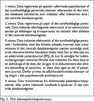 Arbejdet med kliniske databaser indebærer afdelingsbaseret dataregistrering efterfulgt af rapportering om det indikatormålte kvalitetsniveau (feedback) til bl.a. den afdeling, der har leveret data. I praksis varierer arbejdsgange vedrørende registrering af indikatordata fra at være rent papirbaserede til at være rent elektronisk baserede og fra at involvere både administrativt og sundhedsfagligt personale til kun at involvere sidstnævnte. Overgang fra papir til elektronisk dataregistrering på kliniske afdelinger kan karakteriseres ved fire forskellige registreringsniveauer (Fig. 3 ).