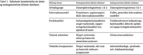 Med baggrund i den ovennævnte beskrivelse af et andengenerationssystem kan førstegenerationssystemerne, med HISA-beskrivelsesmodel som anvendt ovenfor, karakteriseres som vist i Tabel 1 . Heraf fremgår de væsentligste forskelle imellem første- og andengenerations-it-systemer til kliniske databaser. For klinikerne vil det mest iøjnefaldende ved andengenerationssystemerne være, at det forventes, at data registreres elektronisk af det kliniske personale som en integreret del af det kliniske arbejde. Populært sagt går klinikerne online i deres indikatorregistrering. Dette forhold indebærer en række konsekvenser, som afspejles i de fire øvrige HISA-view (Tabel 1). Samlet vurderet peger forskellene i retning af en udvikling, der bryder med den hidtidige decentrale udviklingsfilosofi for kliniske databaser i retning mod en teknologisk centralisering med bevaret decentralt ansvar for datakvaliteten ved indrapportering og bevaret kontrol med egne data. Herved skal teknologien tilgodese, at en given a fdeling har fri adgang til egne data, men ikke til andres.