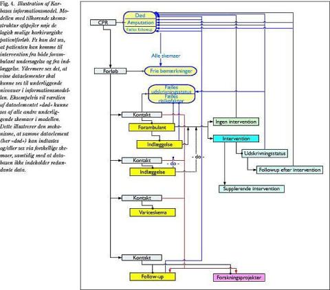 Landsregistret Karbase er en ældre landsdækkende klinisk database, etableret i 1989 med et til tidsalderen svarende førstegenerationssystem. I 2002 overgik Karbase til KMS som ny it-teknologisk platform i et samarbejde med H:S Enhed for Klinisk Kvalitet og Sundhedsstyrelsen. Systemet kaldes i det følgende for KMS Karbase. Den informationsmodel, der er bygget op i KMS Karbase er vist i Fig. 4 . Transformationen fra gammelt system til nyt system foregik i en række trin: