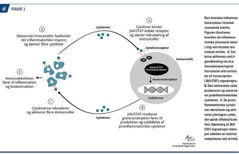 vil JAK aktivere STAT, der fungerer som transkriptionsfaktorer og dermed har indflydelse på cellernes funktion, vækst og aktivitet. Derfor er JAK/STAT-signalvejen af stor betydning for mange cytokiners og vækstfaktorers effekt [5]. Cytokiner som bl.a. IL-6 og granulocytmonocytkolonistimulerende faktor (GM-CSF) spiller en væsentlig rolle ved kronisk reumatoid artritis; det er derfor oplagt, at en hæmning af den overaktive JAK/STAT-signalering vil kunne forbedre den kliniske tilstand hos patienter med kronisk reumatoid artritis [3]. JAK-inhibitorerne tofacitinib og baricitinib binder til JAK og hæmmer deres signalering. Midlerne har dog ikke ens affinitet mod de forskellige typer JAK og udviser derfor små forskelle med hensyn til både behandlingseffekt og bivirkninger [6, 7]. Ligeledes har de lidt forskellig farmakokinetik. Tofacitinib inhiberer især JAK1 og JAK3 og gives oralt × 2 dagligt, imens baricitinib især inhiberer JAK1 og JAK2 og gives oralt × 1 dagligt.