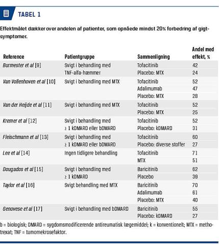 Ved kronisk reumatoid artritis er der udført en række kliniske randomiserede studier af tofacitinib og baricitinib. I studierne har man givet patienterne tofacitinib eller baricitinib, enten som monoterapi eller kombineret med diverse DMARD. Herefter har man undersøgt tofacitinibs og baricitinibs effekt på sygdomsaktiviteten, primært ved at observere forbedringen af antallet af hævede og smertefulde led hos patienterne (Tabel 1).